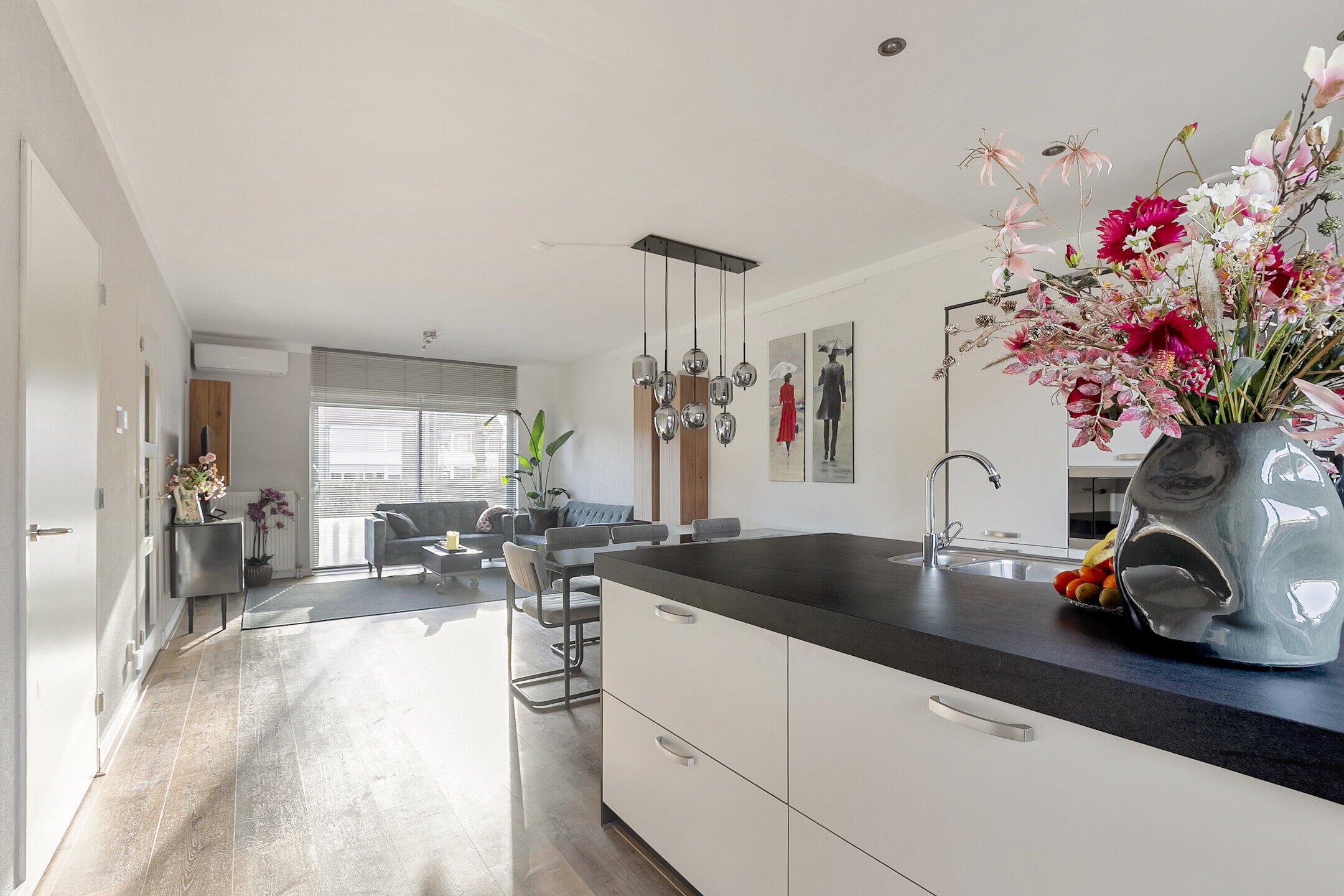 Entree in de hal met modern toilet met fonteintje en de meterkast. Vanuit de hal kom je in de lichte woonkamer die praktisch is ingedeeld met een zithoek aan de voorzijde en een schuifpui naar het terras in de voortuin.