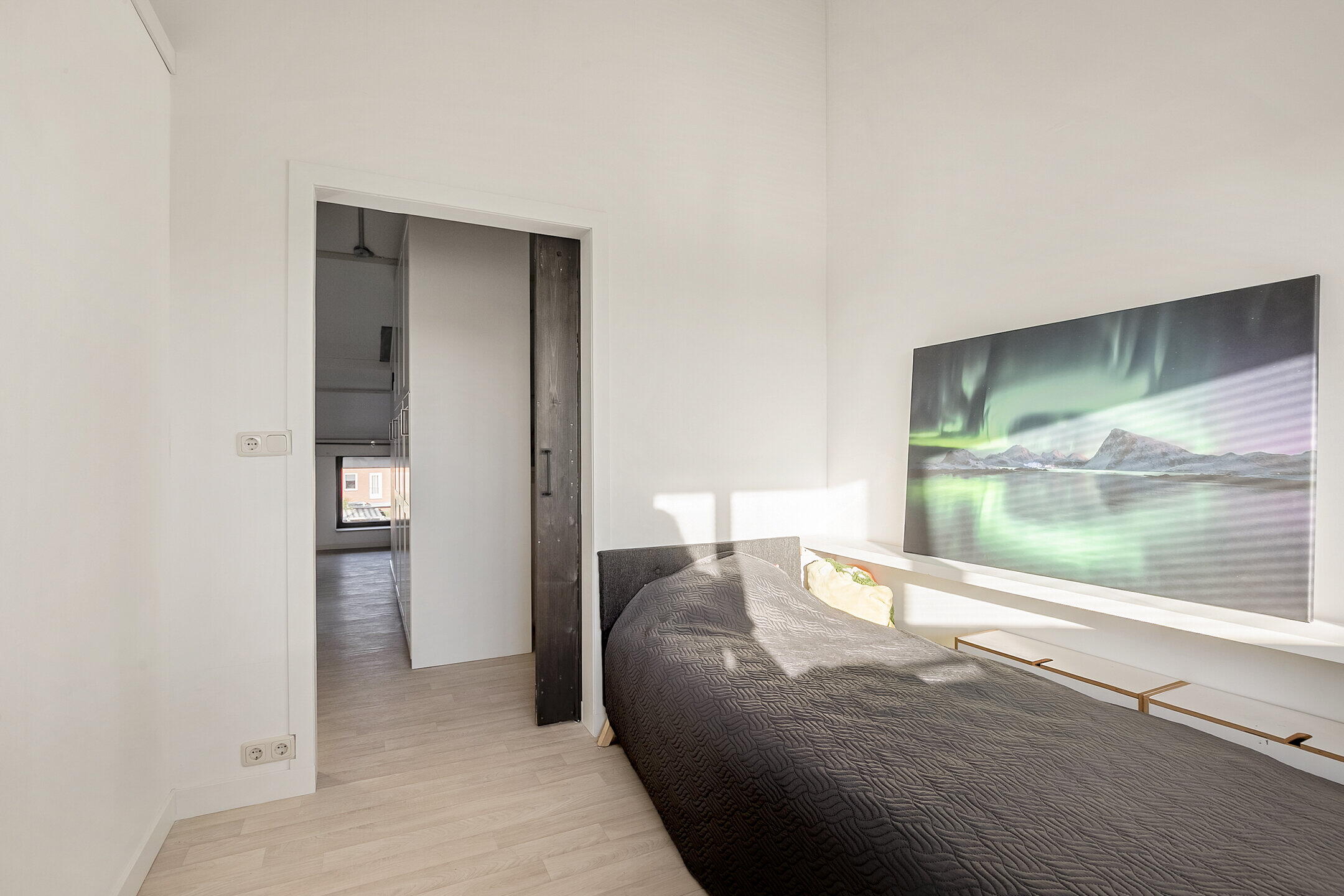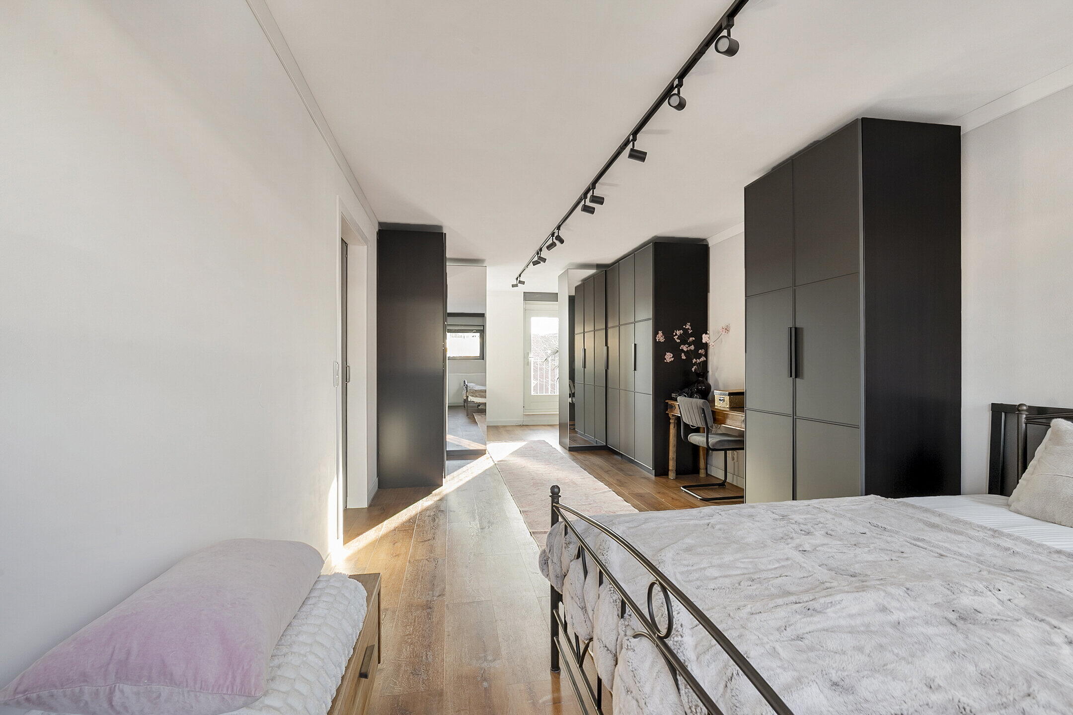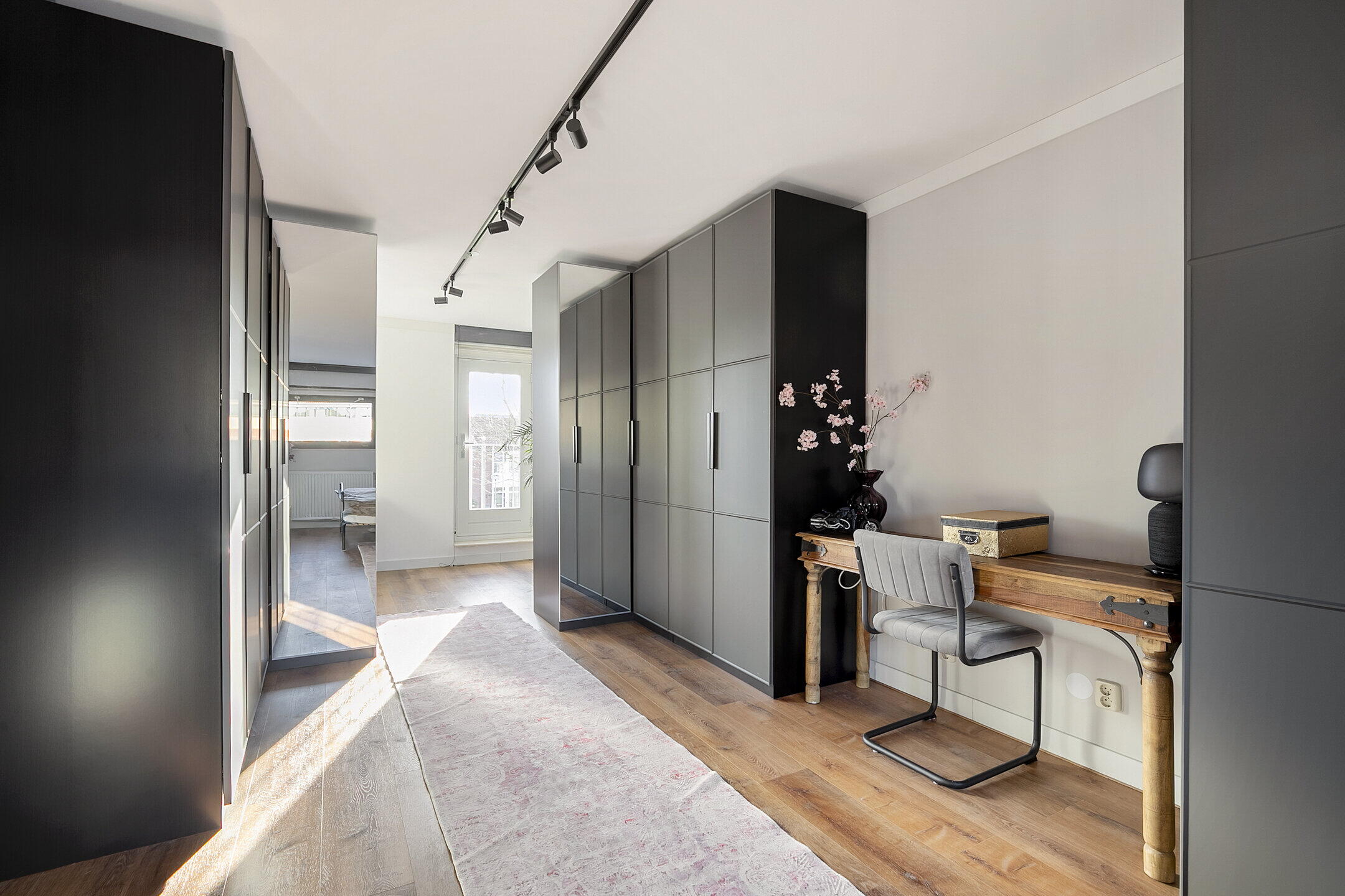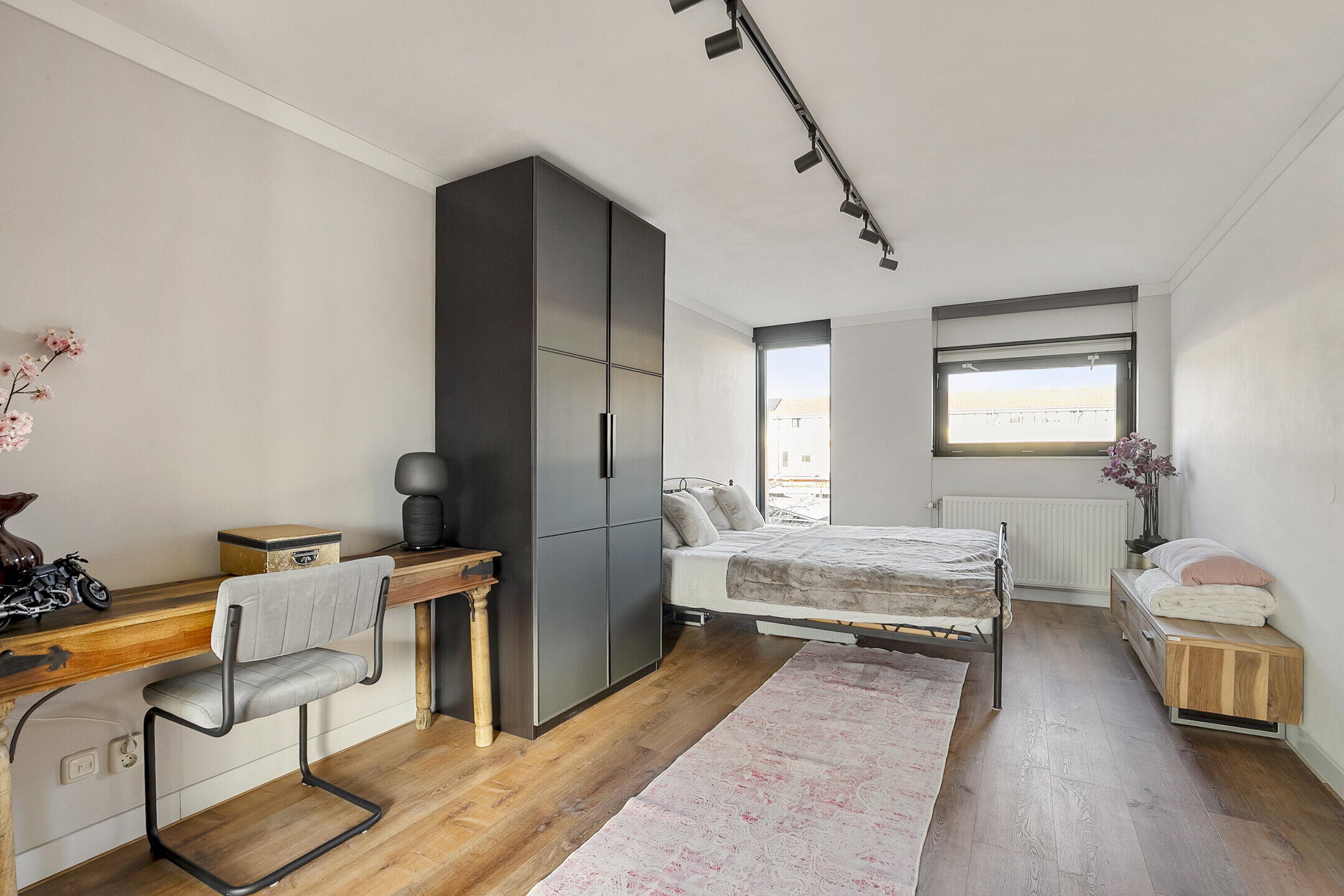 Overloop met toegang tot 2 slaapkamers met een Frans balkon (voorheen drie kamers), en de moderne badkamer. Eén slaapkamer is royaal en biedt ruimte voor een grote kastenwand en eventueel een werkplek. De badkamer is compleet ingericht met een ligbad, een aparte douche, 2e toilet en een dubbele wastafel met meubel. De slaapkamers op deze verdieping zijn afgewerkt met een pvc-vloer.