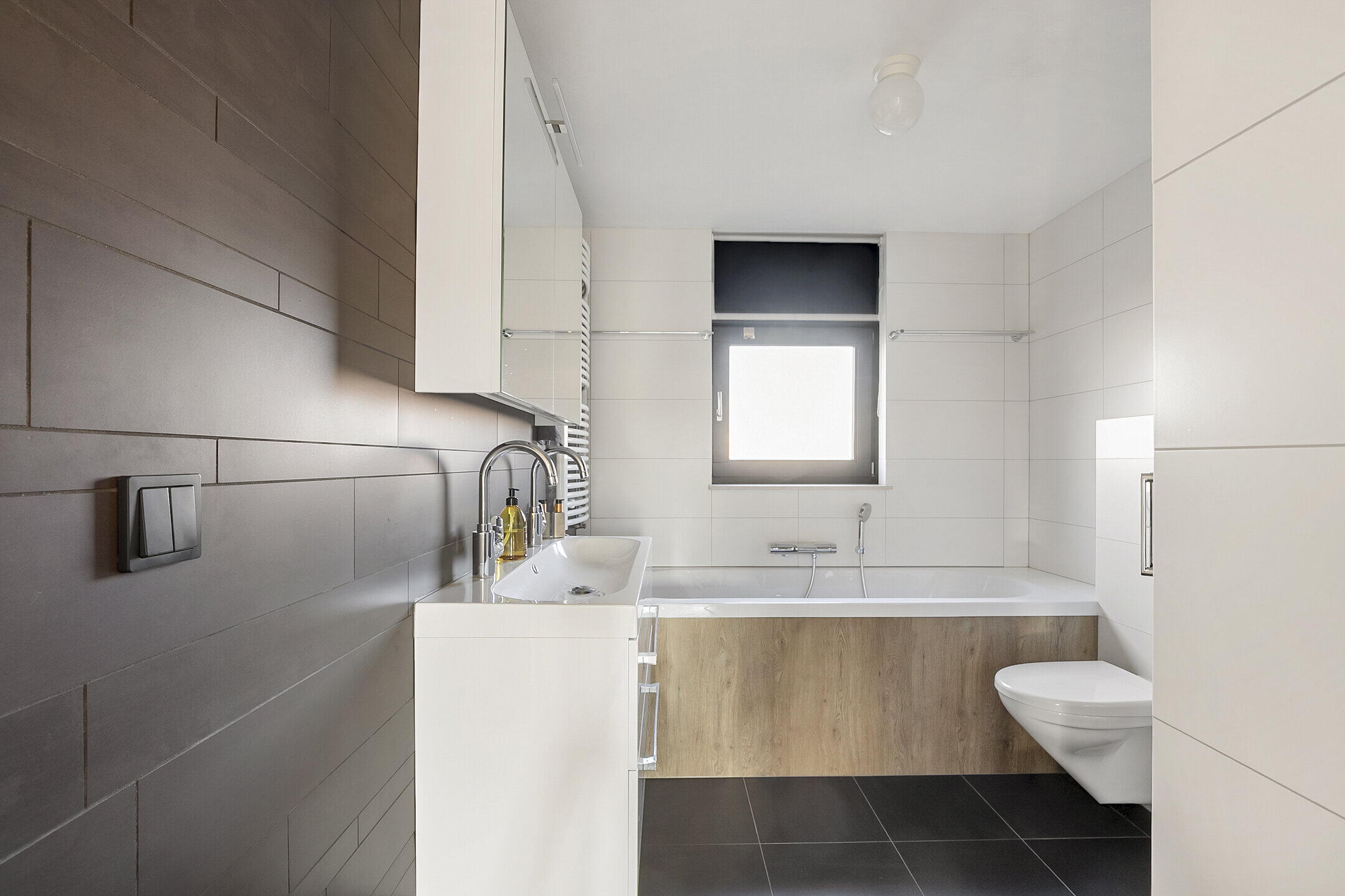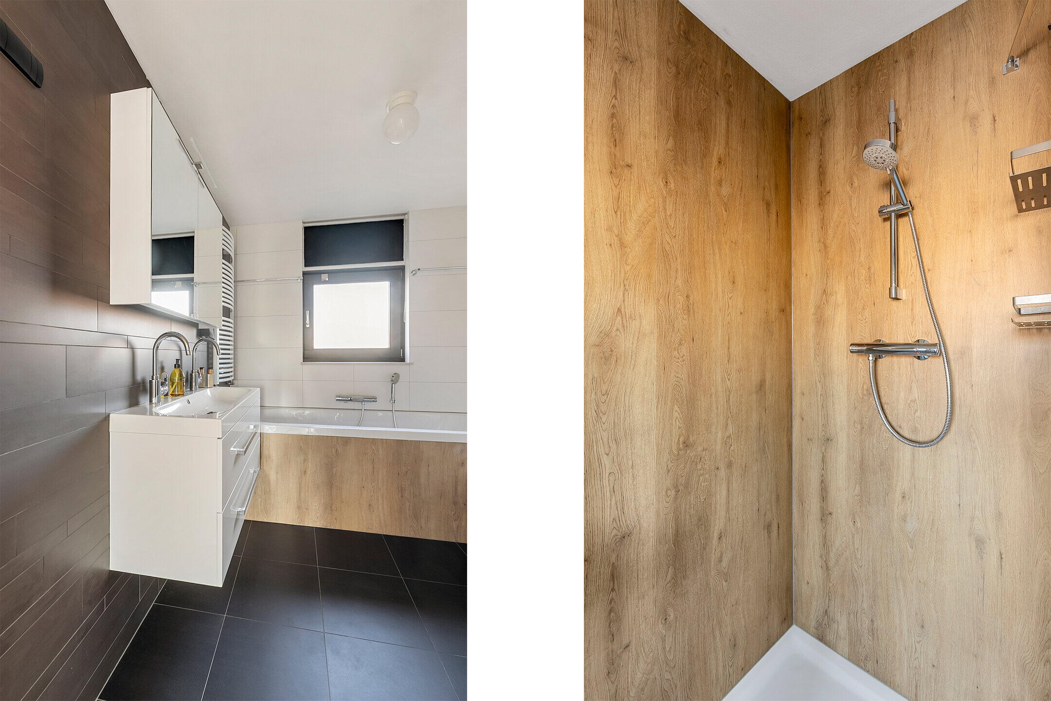 - Ligbad, toilet, douche, dubbele wastafel, wastafelmeubel