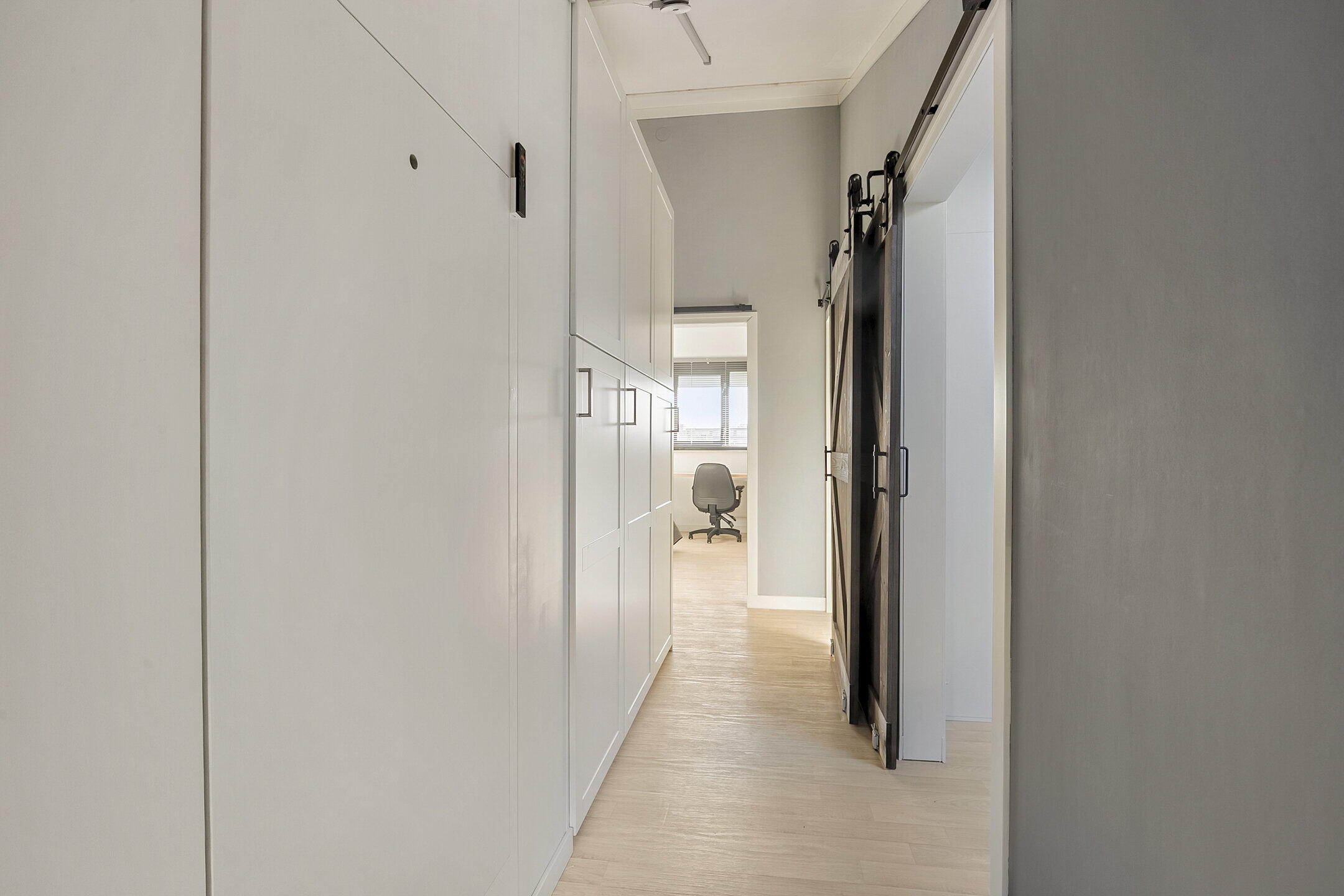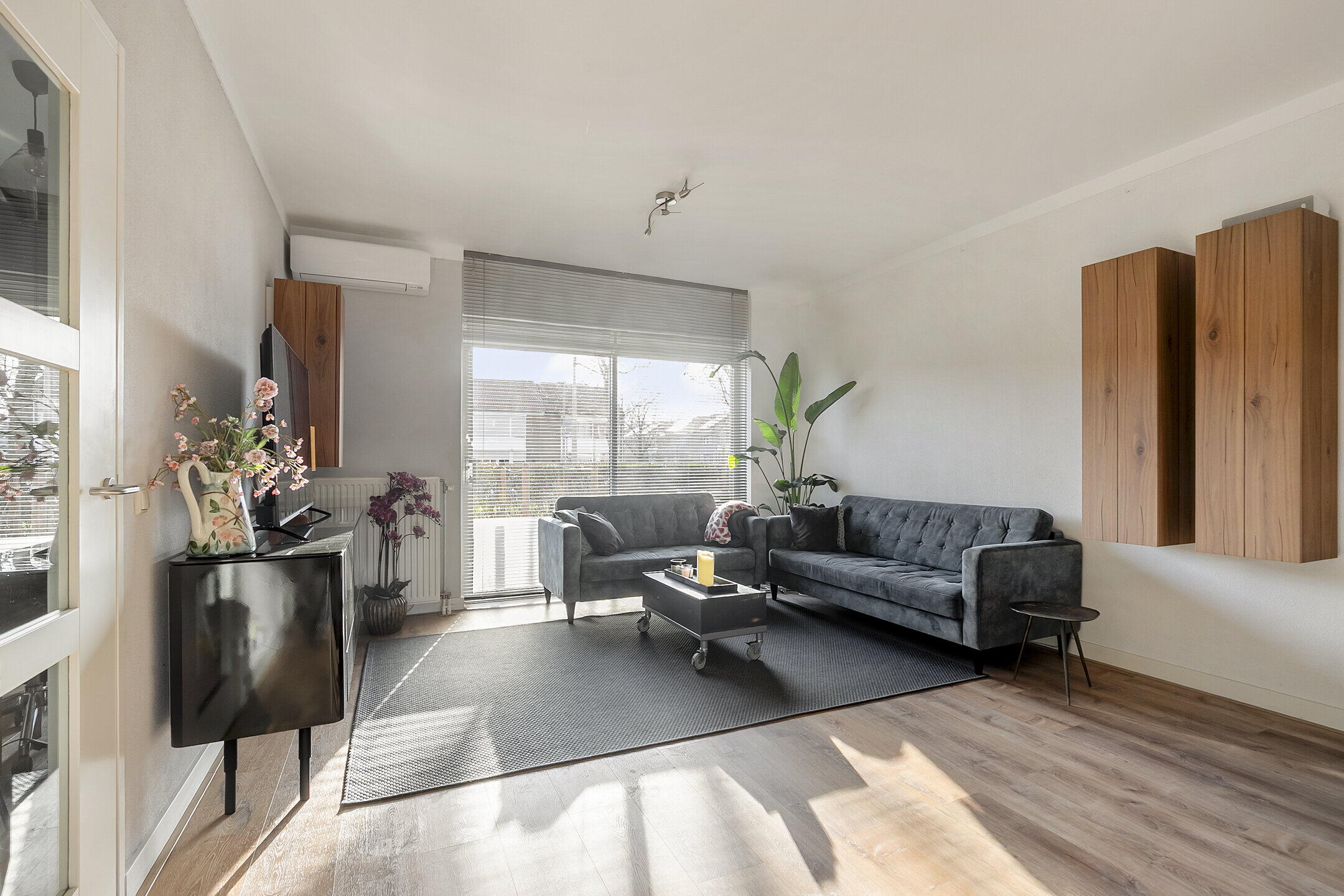 Via een tweede hal bereik je de trapopgang en de achtertuin. De begane grond is voorzien van een neutrale pvc-vloer en een airco.